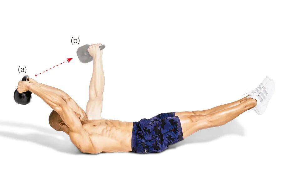 尽量将壶铃伸到头顶,同时保持下背部紧贴地面;