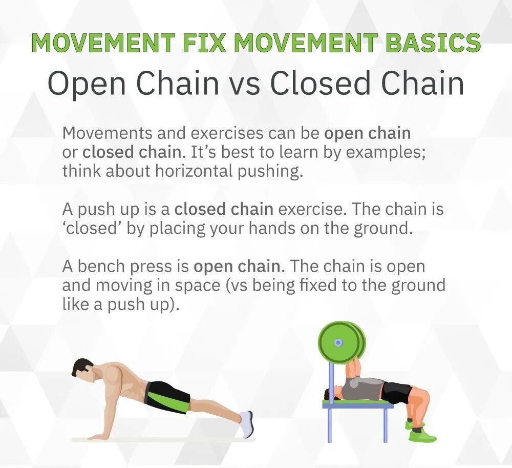在闭链运动中,链的末端(即肢体或肢体做运动)固定在地面上。经典的例子包括深蹲、硬拉、俯卧撑和引体向上,在这些动作中,你的手或脚保持不动。在开链运动中(例如卧推、二头肌弯举、三头肌拉伸、侧平举),链的末端不是固定的。