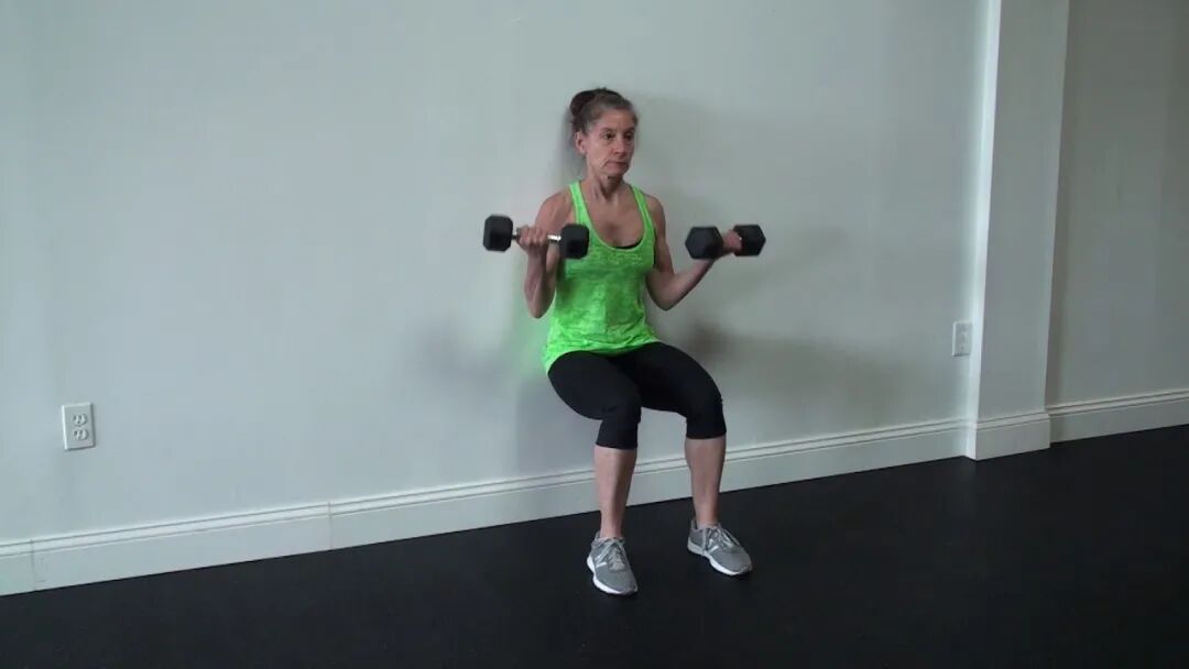 在靠墙静蹲的姿势中,进行二头弯举(一起或交替),在双腿燃烧的同时锻炼肱二头肌。