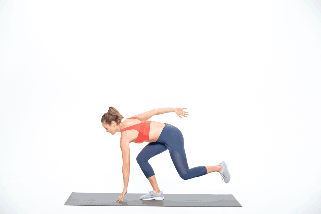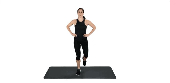 首先,以站立的姿势开始,将重心转移到左脚,右膝上抬,左臂向后弯曲(就像在跑步一样)。