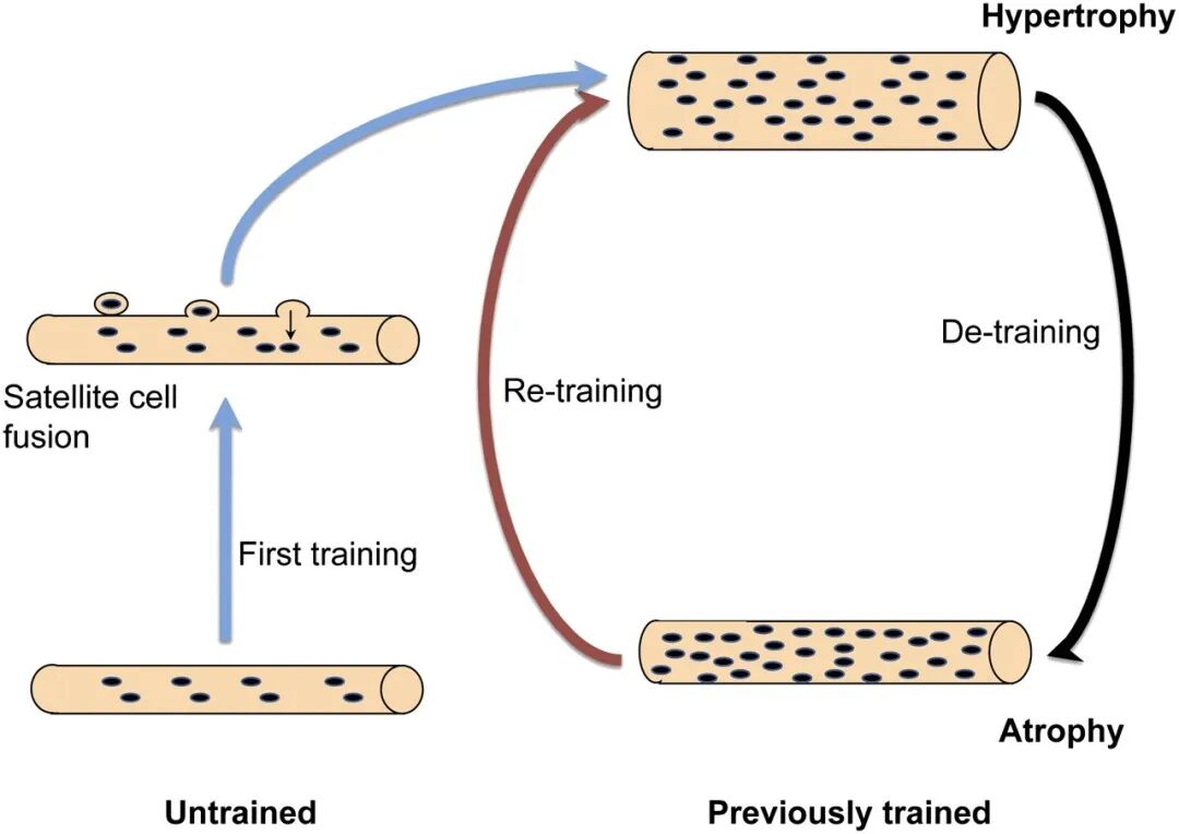 这意味着,一旦你通过力量训练获得了一定的肌肉量,那么即便你是在一段时间的休息(不运动)后,失去了一些肌肉,你也可以比最初增加肌肉花费的时间更快的恢复肌肉量。
