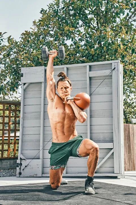 如果你想这么做,可以先站着,然后左手拿一个壶铃放在肩膀上,右手拿哑铃放在肩膀上,保持壶铃接近你的胸部,把哑铃举过头顶,然后下降,每侧做3组,每组8-10次。