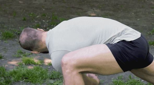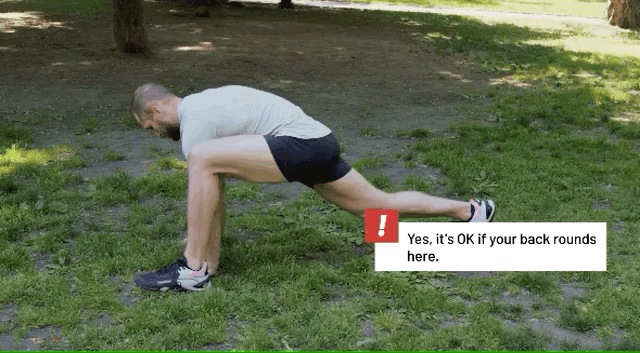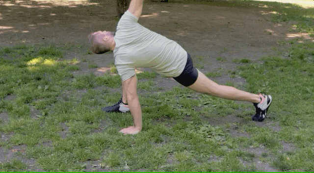 以俯卧撑的姿势开始,你的腹肌和臀大肌都会被募集到,而且还可以训练你的核心以稳定下背部,同时你也在挑战和打开紧绷的臀部,当你在每次重复中达到最高点时,你还可以挤压肩胛骨并拉伸胸肌。