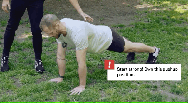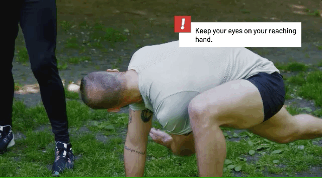进入俯卧撑姿势,将脚向前跨向你的手,这是第一步;把手放下来,双手放在地上,这是第二步;将一只手抬离地面,躯干朝前面的膝盖转体,并保持在该位置,这是第三步。