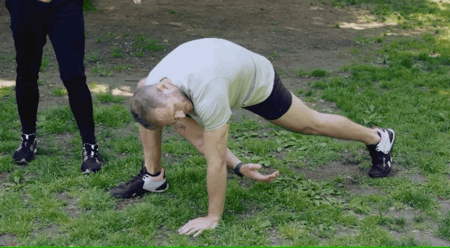 这个动作被称为「蜘蛛侠弓箭步转体(Spiderman lunge with rotation)」,直截了当地说,每个40岁以上的人都应该尝试这个动作。