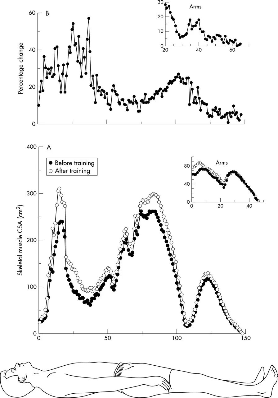 在肩部、胸部、大腿上部和上臂出现肌肉横截面积的最大绝对增加。与腰部、臀部、前臂、大腿和小腿(+10~20%)相比,肩部、胸部和上臂(+25~40%)肌肥大的相对变化更大。所有3名受试者的肌肉横截面积的相对增加在肩部(横截面积的峰值水平)为26%,在大腿中部和小腿分别为18%和9%。