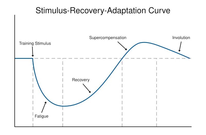 为了让我们的力量更大,让肌肉长得更大、更强壮,身体必须经历一个受刺激的过程,在这个过程中会不可避免地遇到疲劳,只有从疲劳中恢复过来,身体才能适应和生长,这个过程就是“刺激-恢复-适应”(stimulus-recovery-adaptation,SRA),可能解释的有点粗糙,但大概就是这么个意思。