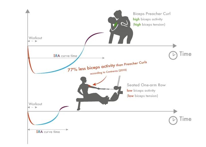 如下所示,如果你练哑铃弯举的时候只练下半程,则肱二头肌在拉长时会达到峰值张力,这会导致更多的肌肉分解和更长的SRA曲线。但如果你只练上半程,当它缩短时会出现峰值张力,从而减少肌肉分解,并缩短SRA曲线。