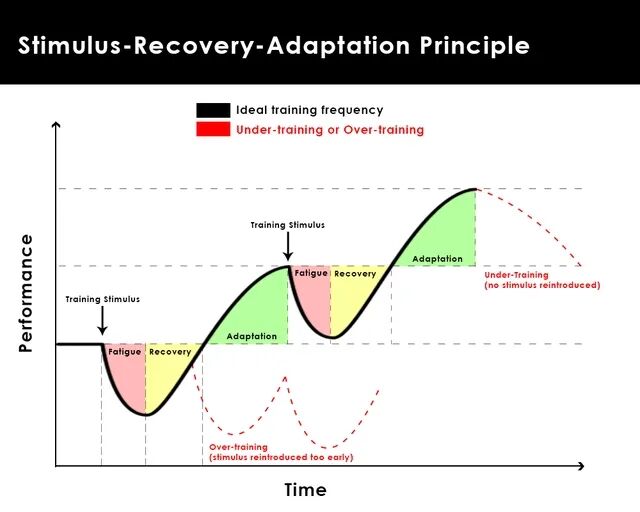 SRA曲线主要包括3个阶段。第一个是刺激,它在图1中的英文是Training Stimulus。当我们开始训练时,无论你的目标是增力还是增肌,它都会刺激我们的肌肉。除了肌肉,身体的中枢神经系统也会受到刺激,因为身体必须有意识地移动重量并调整呼吸以适应训练期间的不同强度。