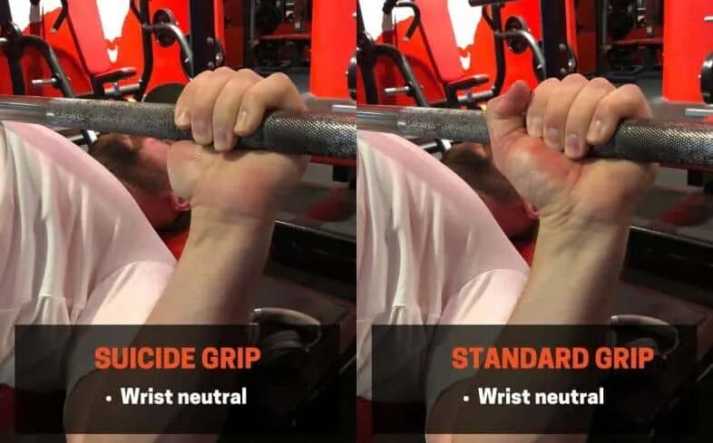 你可以使用全握和自杀式握法来达到相同的手腕中立位置。当你做卧推时,你需要将重量置于手掌底部,这样重量就会与前臂处在一条直线上。
