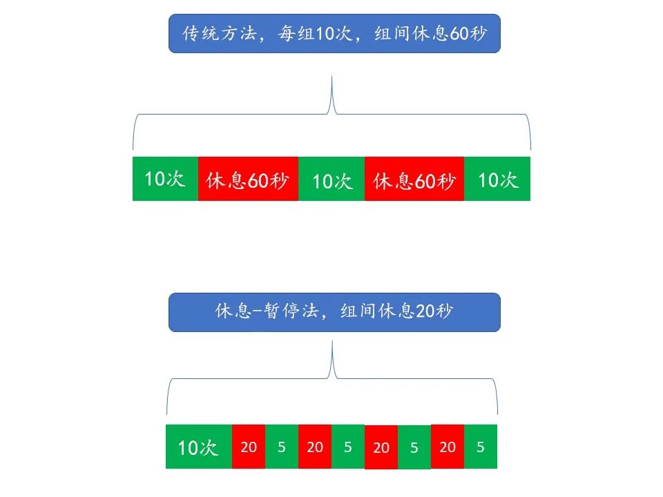 休息-暂停组是一种增加密度的方法,与传统组相比,会产生类似或更大的肥大效果。例如,你的训练需要做三组,每组重复10次,传统上组间休息时间是60秒。相反,你可以只做一组10次的,然后再做4组每组5次的,通过把组间休息压缩到20秒来增加训练密度。