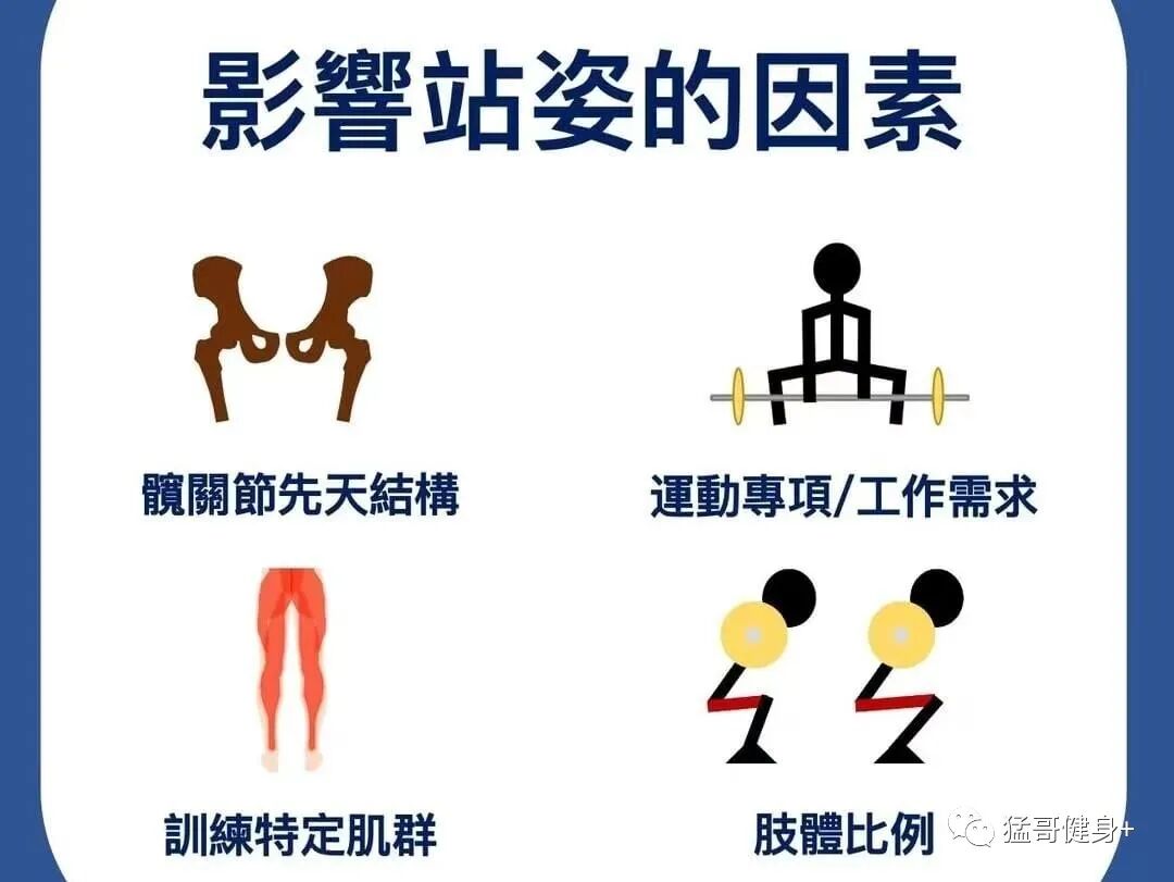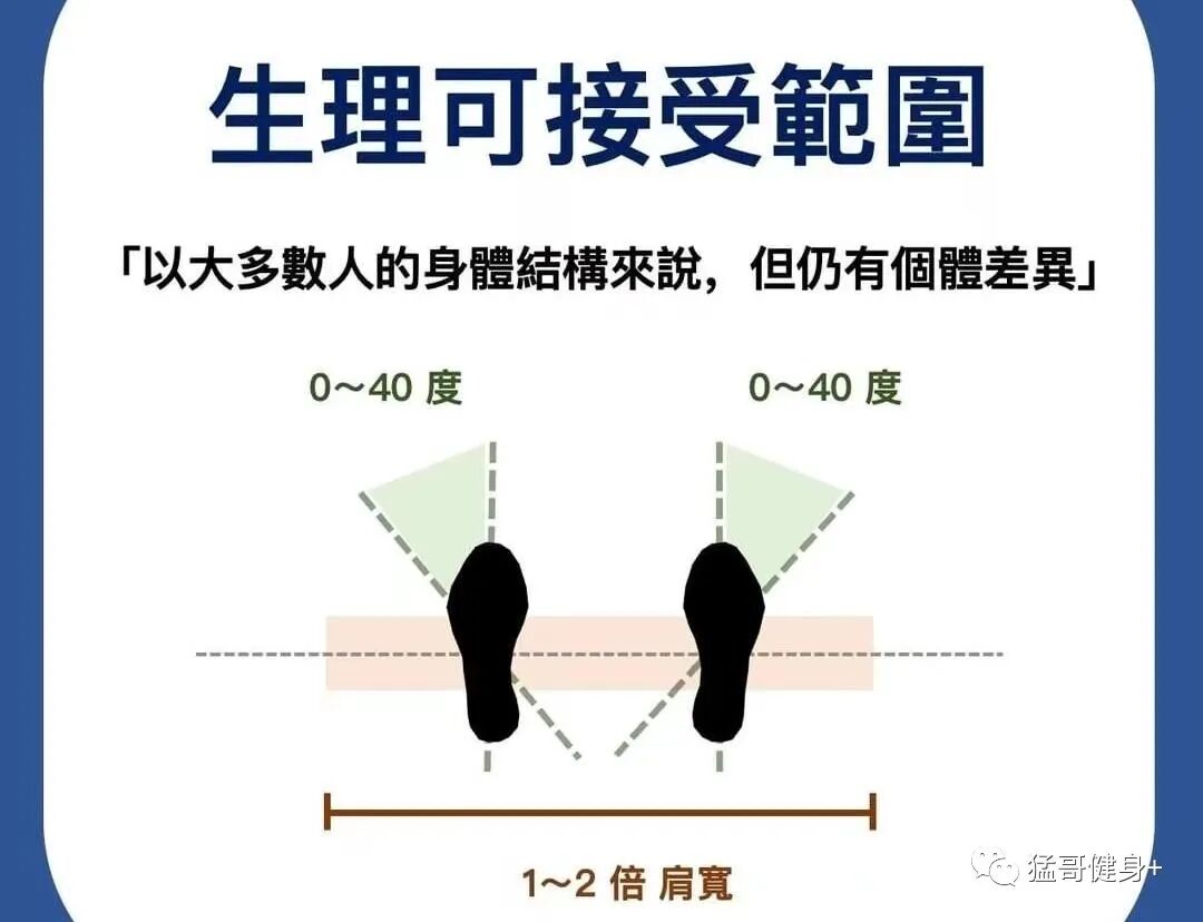 其实这并没有标准答案,因为每个人身体的灵活度不同、是否曾经受过伤、甚至从事的运动项目和需求也不同,因此只要在合乎身体可承受的范围之内,舒服的站宽和脚尖角度就是适合的,以下几点可供参考: