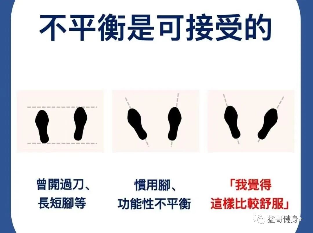 有时候双脚站距、脚尖向外的角度有些许不一致也是可以接受的。首先人体本来就存在不平衡,包括身体器官的位置、惯用手脚不同等;其次是健身者的经历,例如骨折手术、平时的工作环境、略微的长短脚,都会导致双脚站姿的不一致。如果在追求双脚一致的过程中反而更不舒服,可能要特别注意。