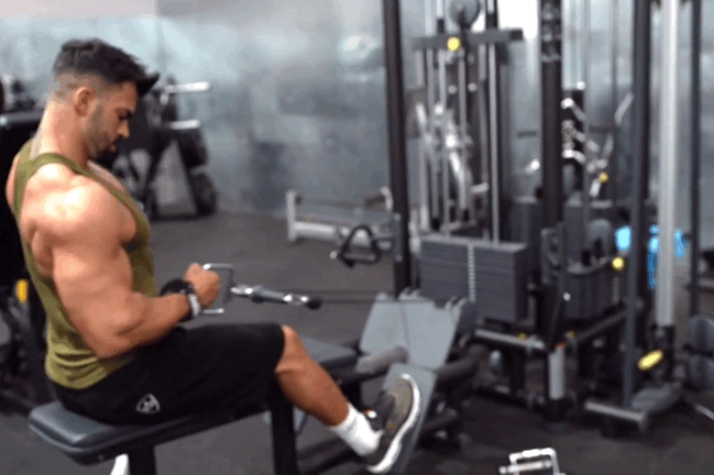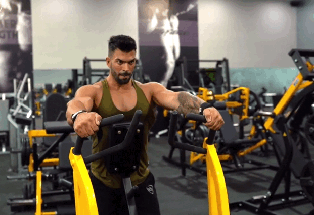 胸部贴紧挡板,双手握住器械把手,腹部和臀部收紧,身体保持稳定。拉回时呼气,肘尖带动握把向身体后方拉动,直至背部完全收紧;放回时吸气,肩胛不要前送。握把位于胸部高度,上背刺激更好;握把位于腹部高度,对中下背刺激更好。