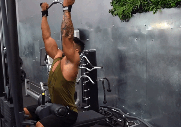 坐在高位下拉器械凳面上,双腿在滚轴下方固定。选择一个宽距握把,四指勾住两端。挺胸收腹、头部上扬,屈肘将握把竖直向下拉动直至最低点,此时握把下放至胸廓下沿,背部收紧。缓慢伸直手臂、控制握把向上复原,此时背部肌肉会有拉伸感。