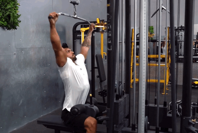 这个动作和引体向上非常类似,但能够使用小重量完成,健身新手和背部发力感较差的健身者,可通过这个动作找到背部肌肉发力感,为学习引体向上奠定基础。