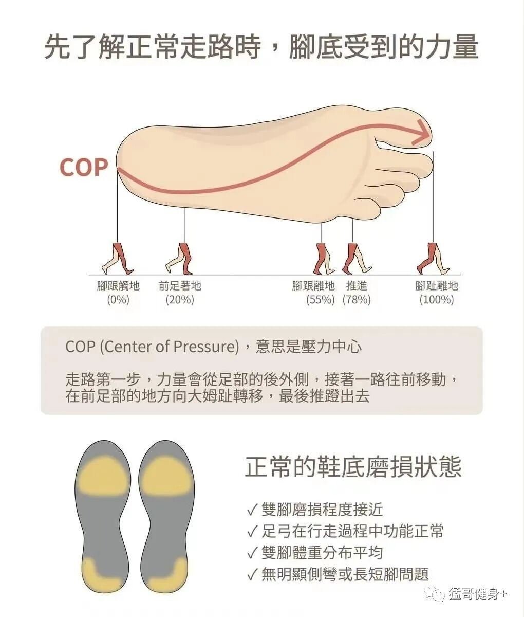 当我们以正常的步态脚着地时,足底的压力中心会从足跟后外侧一路往前移动,最后到前脚掌和大脚趾往前推进。