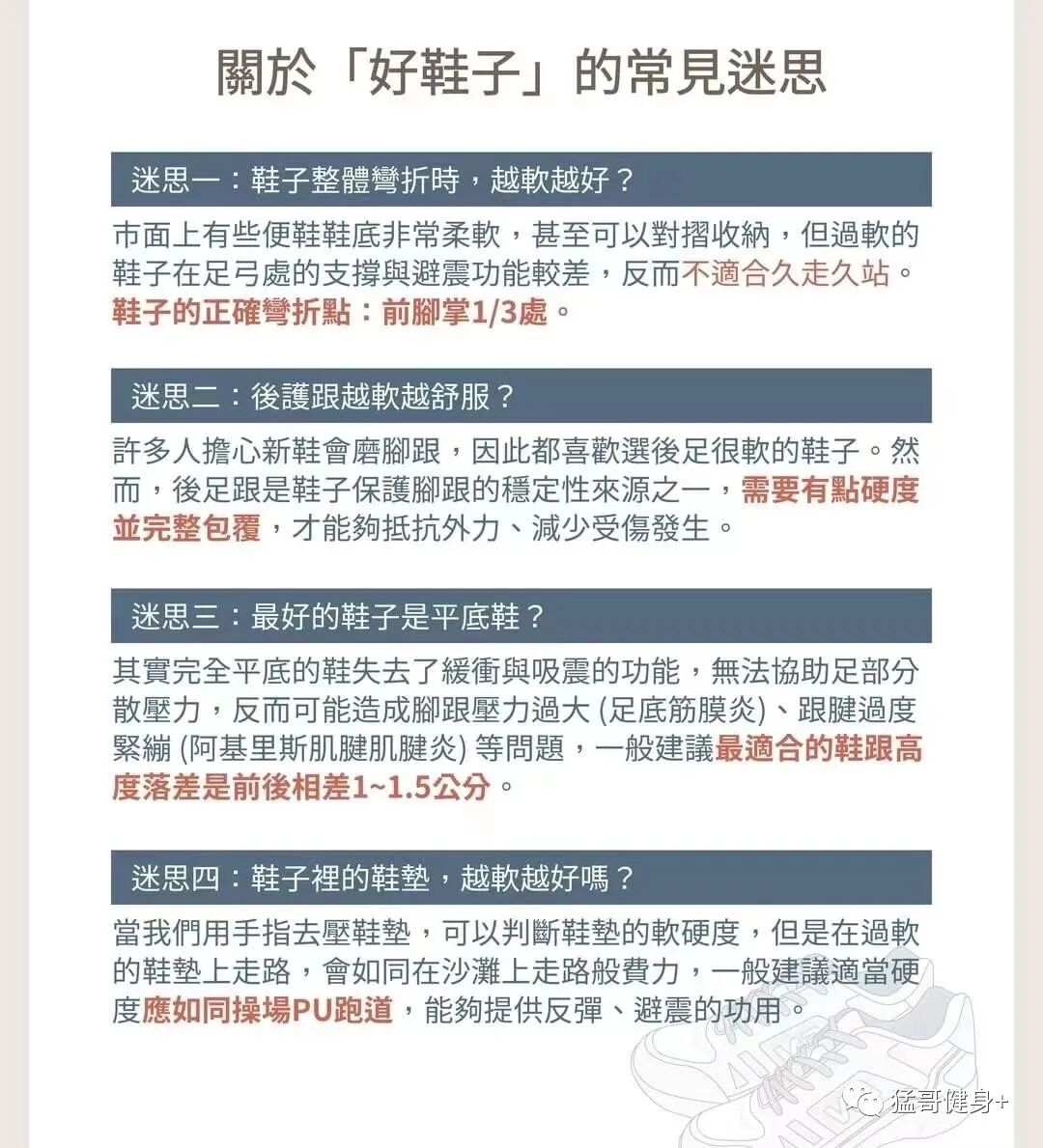最后简单说说训练时应该怎样选择合适的鞋。当做深蹲、硬拉这类力量训练时应该尽量选择防滑、底平而偏薄的硬底运动鞋,例如板鞋,尽量避免选择带有气垫软垫类的鞋,这样防滑性、稳定性和包裹性才有保障。