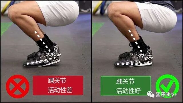 如果健身者的踝关节缺乏足够的灵活性(踝关节背屈受限),可能会通过改变足部力学支撑方式来获得更多的活动范围,通常表现为双脚过度外翻,足/踝关节复合体内旋或将脚跟抬离地面。研究表明,踝关节活动受限可能会导致膝关节外翻,这往往是造成髌髋关节疼痛甚至前十字交叉韧带损伤的原因。