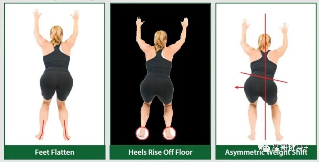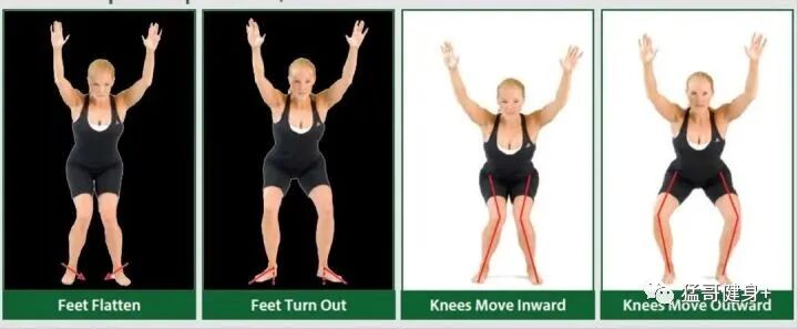 深蹲时最显著的代偿是膝关节外翻,也被称为内侧膝关节移位。膝关节外翻是膝部损伤的主要诱发因素,包括髌髋关节疼痛(膝关节前方疼痛)和前十字交叉韧带损伤,也可能是由于踝关节和髋关节的损伤。