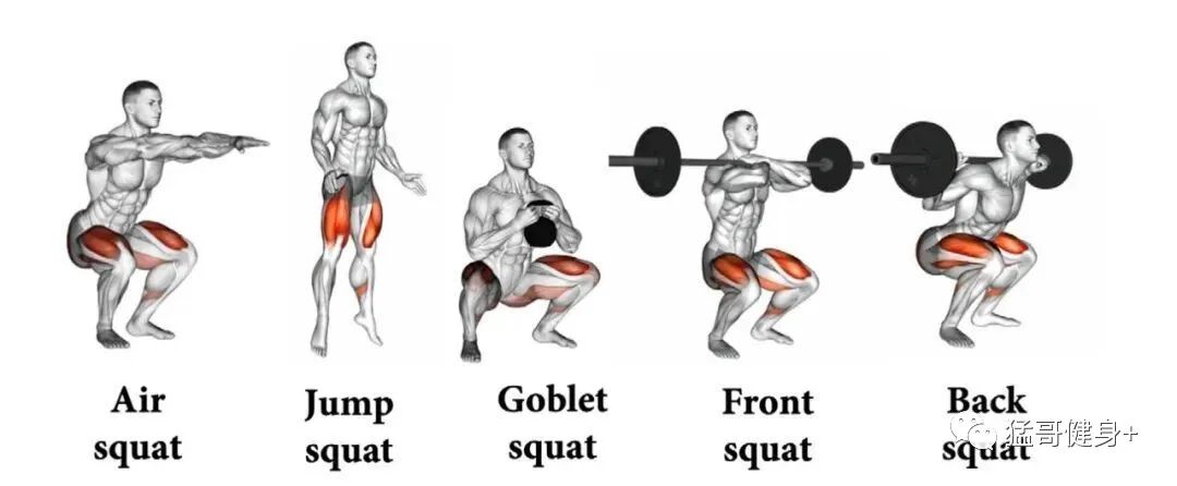 深蹲有很多变式动作,例如自重深蹲、杠铃后蹲、杠铃前蹲、哑铃深蹲、相扑深蹲、高脚杯深蹲、蹲跳、过顶深蹲、单腿深蹲等等。