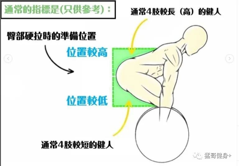 当考虑到复合动作的正确姿势时,我们必须考虑许多不同的变量,例如身体长度、骨架大小等。通常的指标是(只供参考),臀部硬拉时的准备位置:四肢较长(高)的健身者位置会较高;四肢较短的健身者位置会较低。