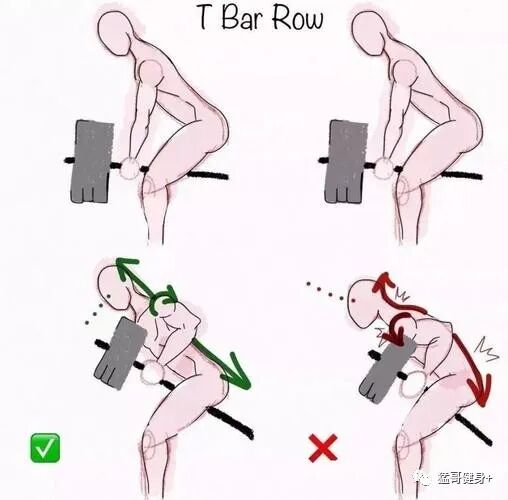 当使用大重量T杠划船时,肱二头肌会不自觉的过多发力,使背部训练变成了手臂训练。建议做动作时,要时刻让背部肌肉带动肩胛骨向后靠拢内收,同时让肩部外旋抬起,再去带动大臂拉起杠铃杠。