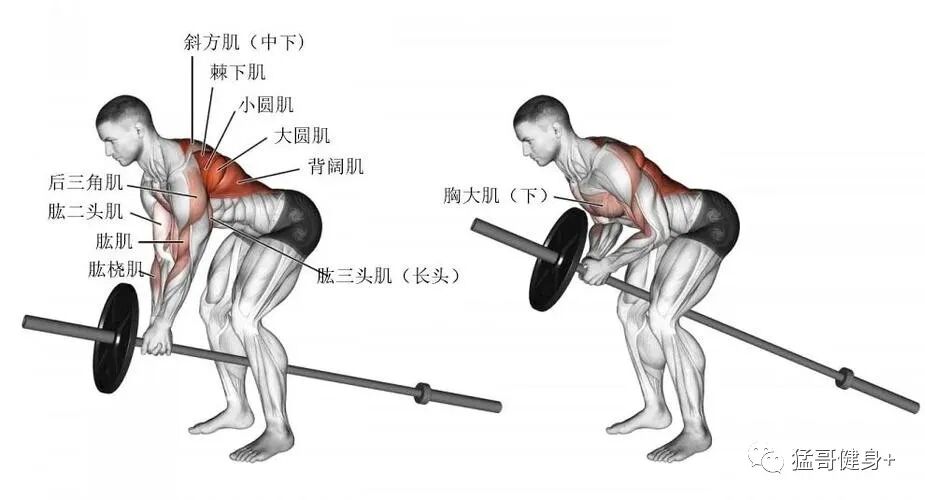 如果觉得上面的表述难以理解,这里有个简单的描述:当拉起重量时,不要想着双手用力把重量拉起来,只要想着双手就是一对“钩子”,只是用来勾住重物的,拉起重量完全是靠双肘向后带动背部肌肉来发力。