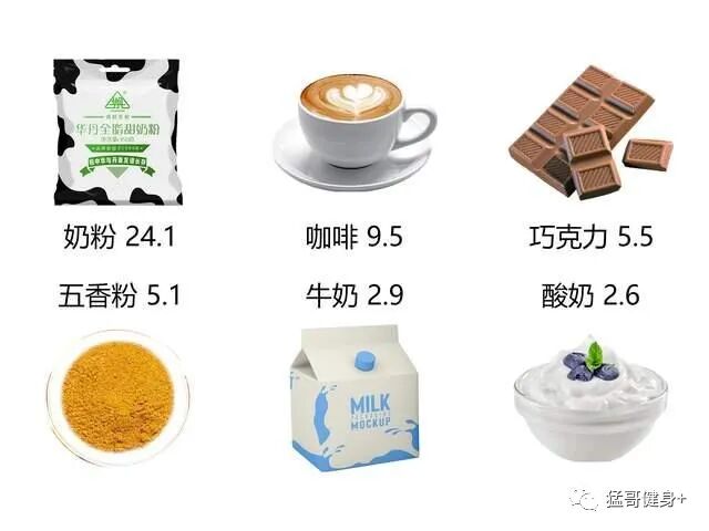 牛奶中含有蛋白、钙和各类氨基酸,并含有不饱和脂肪酸,可以加速脂肪的燃烧,从而避免脂肪摄入过多,帮助健身者减脂并保持良好的体型,是健康的好饮品。下图中牛奶的蛋白含量数值较低,是因为牛奶水分含量较高所致,但牛奶中所含的氨基酸比例符合人体需要,因此属于优质蛋白,其方便饮用的特点,使健身者很容易达到所需的蛋白质摄入量。此外,咖啡和巧克力除了能补充热量外,蛋白质含量也较高。