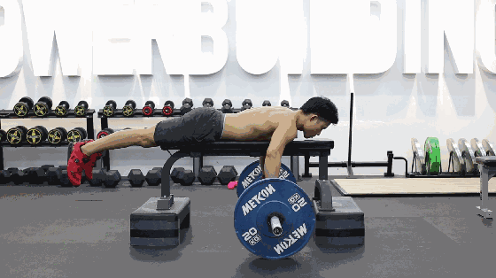 这个动作可以解放下背部的压力,让健身者将更多的精力放在斜方肌和背阔肌上。建议新手在刚开始找背部发力感时采用,因为当俯身在斜板凳上时,动作轨迹也在一定程度上受限,很难借力,所以背部肌肉会得到更好的发力感。