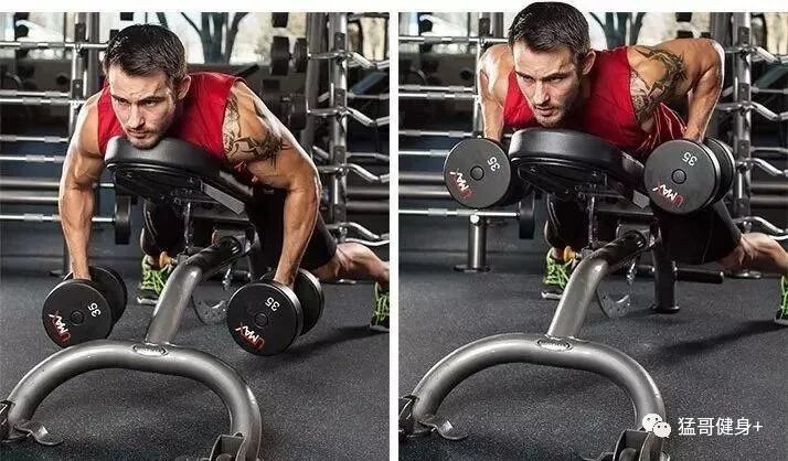 相比于杠铃划船来说,哑铃划船可以在训练的过程中通过调整哑铃外展的幅度,来感受不一样的背部训练刺激。