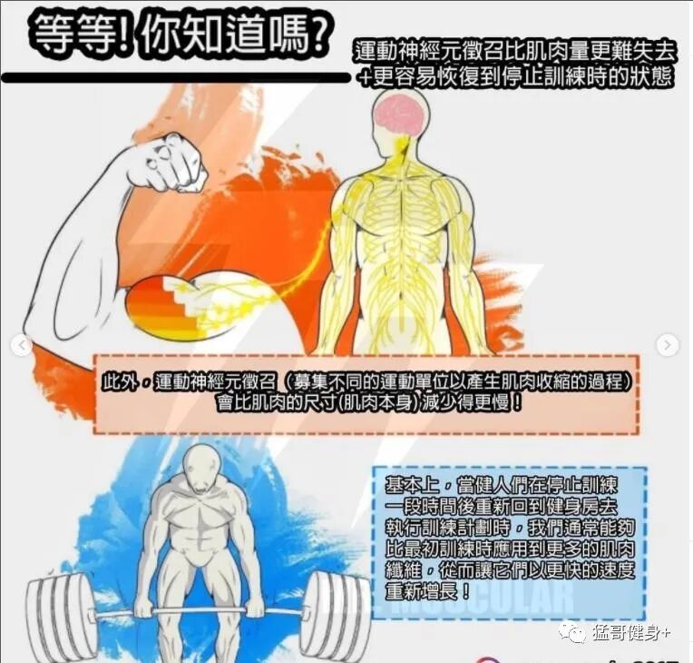 此外,与肌肉的大小相比,运动神经元的募集比肌肉更难失去和更容易恢复,这意味着一旦健身者恢复训练,运动神经元仍然能够募集大部分的肌肉纤维,并施加跟暂停训练之前差不多的力量,有助于肌肉以更快的速度再生。