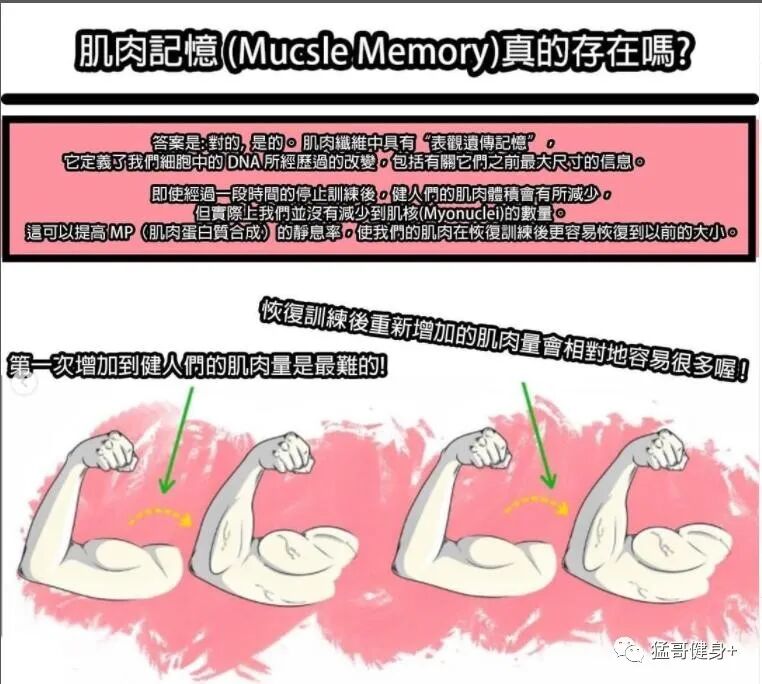 有许多研究证明,“肌肉记忆”是真实的,因为大部分健身者的肌肉都是通过长年累月打造出来的,所以相比第一次长出来的新肌肉,因暂停训练而损失的肌肉会更容易重新长回来。事实上,肌肉纤维具有“表观遗传记忆”,其记住了细胞的DNA经历的变化,包括关于暂停训练之前肌肉细胞大小的信息。