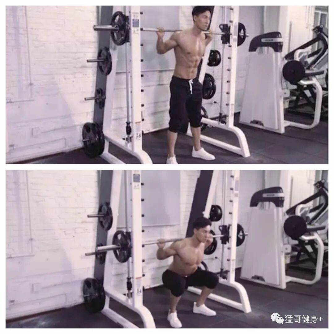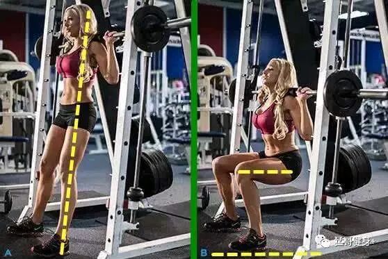 如果健身者在自由深蹲时的重心位置不好把握,可以先采用史密斯架来练习深蹲。需要特别注意的是,这里说的史密斯架是直上直下式的史密斯架,而非重心偏向于脚后跟的斜向式史密斯架(如下图)。
