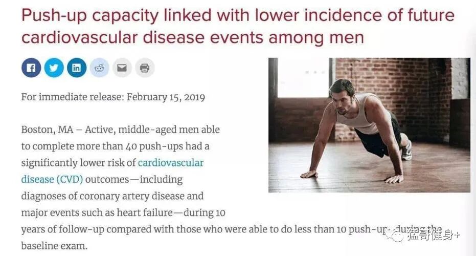最近有研究显示,做俯卧撑就能评估男性的心血管健康状况,凡是能在规定时间内做完40个俯卧撑的男性,要比做不到10个俯卧撑的男性,10年内心血管疾病的发病率可以降低96%。