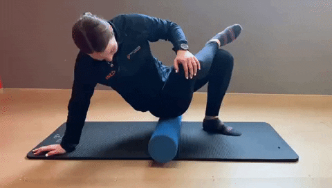 将泡沫轴放在右大腿髋部前侧以及腹股沟的位置,左小腿可以搭在右小腿上,慢慢的滚动,直到完全放松再换另一侧继续。