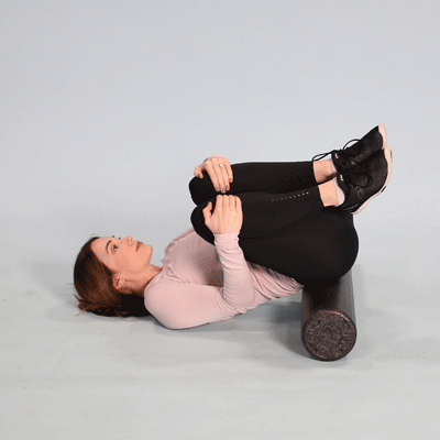 仰卧在垫面上,将泡沫轴放在骶髂关节的位置,屈双膝,双手抱住小腿前侧左右摇晃,直到放松。