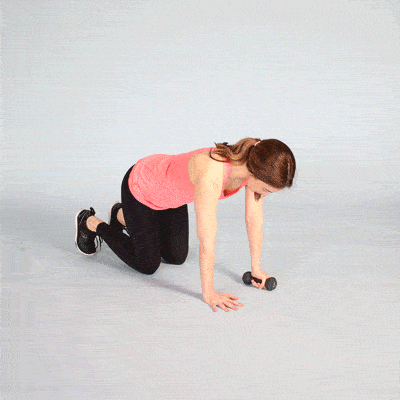 身体慢慢向前倾斜,将手放在垫子或者地板上,手臂位于肩膀正下方,与肩同宽,手指朝前。此时如有必要,可重新调整手和膝盖的位置,确保膝盖位于臀部正下方,而手位于肩膀正下方。