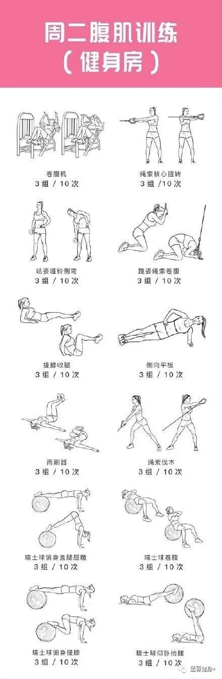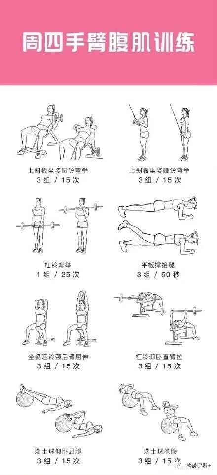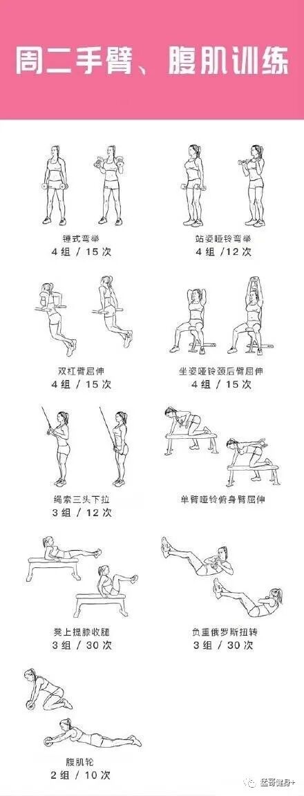 以下是一套每周训练计划动作图解,与常见的每周分部健身法有不小的出入。这套训练计划将核心训练放在了首位,将手臂和腹肌放在一起训练(周二和周四共两天),中间周三休息一天,接下来四、五、六、日连续训练四天。平均每周练两到三次腹肌、手臂和肩,总体来看是以减脂塑形为主、增肌为辅。这套训练计划动作很多,不用完全照搬,作为参考即可,关键是适合自己的才是最好的。