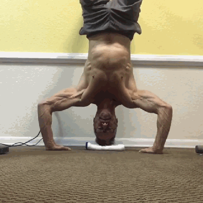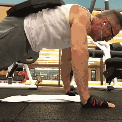 他练胸肌最喜欢的动作就是负重俯卧撑,靠墙倒立俯卧撑也是他常练习的动作之一。
