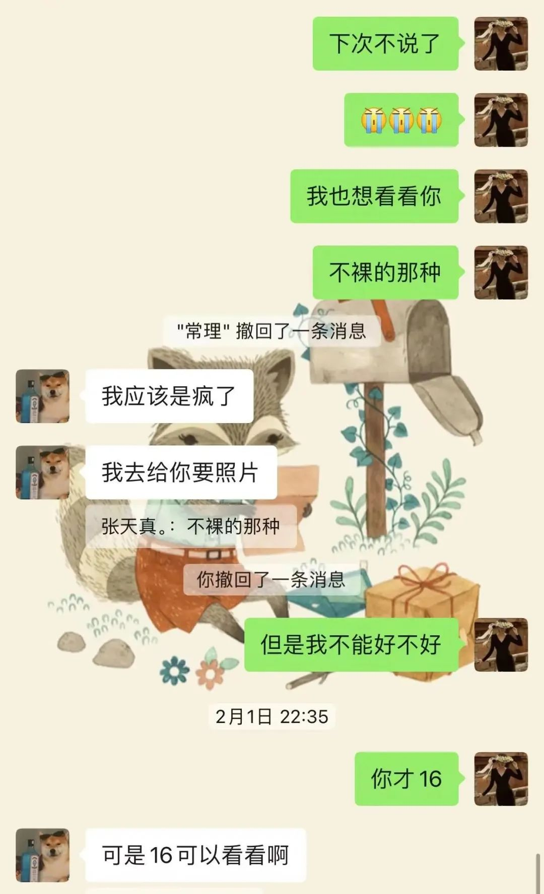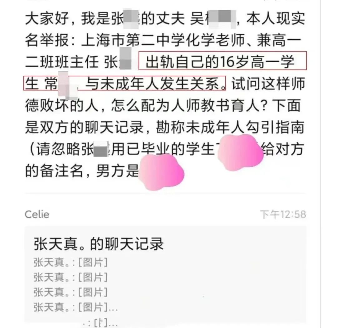 2月16日上午,自称为上海市徐汇区某中学化学老师兼高一班主任丈夫的微信用户,转发公开了多张该女教师张某与其高一男学生的微信聊天,称妻子“出轨”“与未成年人发生关系”。
