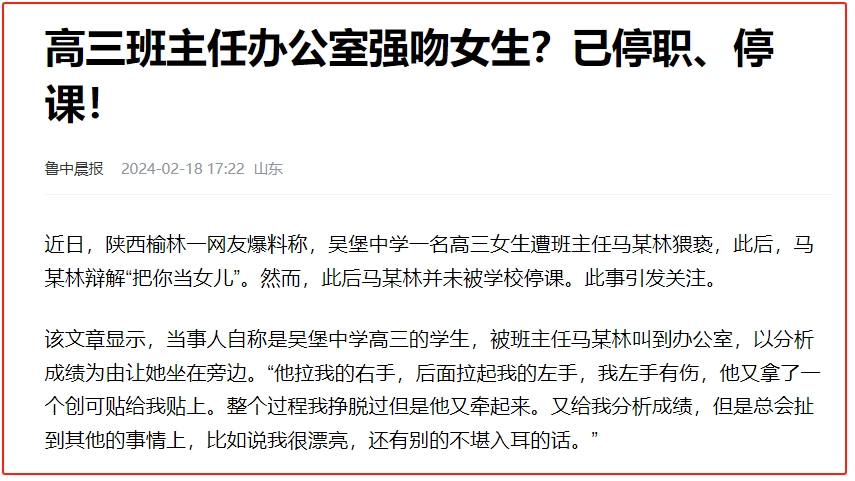 一波未平,一波又起,陕西榆林市吴堡中学也传出消息,一高三女生被班主任马某林猥亵。
