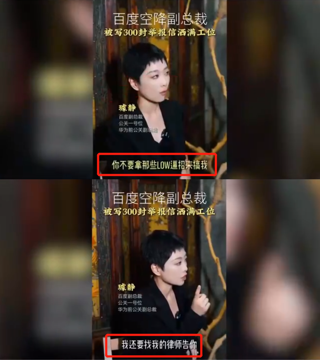 “你不要拿那些LOW逼招来搞我,我还要找我的律师来告你。”一条视频中璩静自称刚入职百度副总裁时,就被写了300封举报信洒满工位。“我觉得这是最下作的方式,投诉的内容大部分都是诽谤和杜撰,想把我搞走,你还要在这继续混吗?”