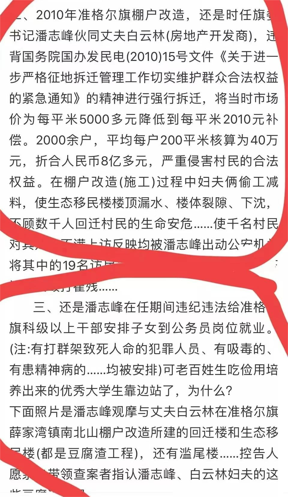 潘志峰与白云林在棚户区改造和生态移民楼上,存在豆腐渣工程和烂尾楼,牵扯到与他人合谋侵吞数亿拆迁款;