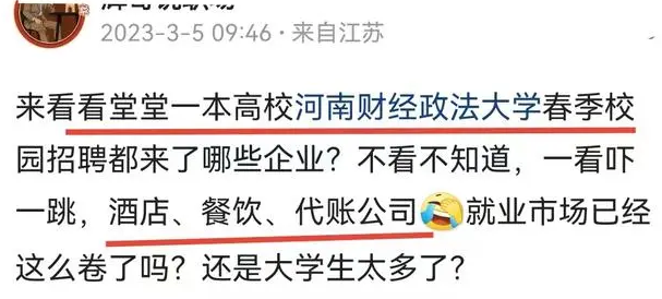 前段时间春季校招,一本高校河南财经政法大学里,酒店服务员、传菜生、行李员、收银员、洗碗工等招聘岗位赫然在列。