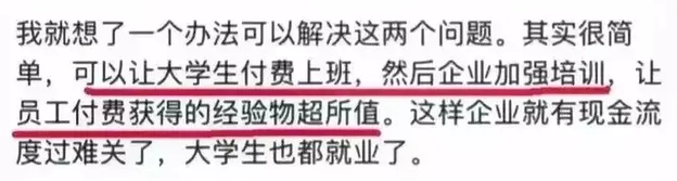 “让大学生付费上班,然后企业加强培训,让员工付费获得的经验物超所值。这样企业就有现金流渡过难关了,大学生也都就业了。”