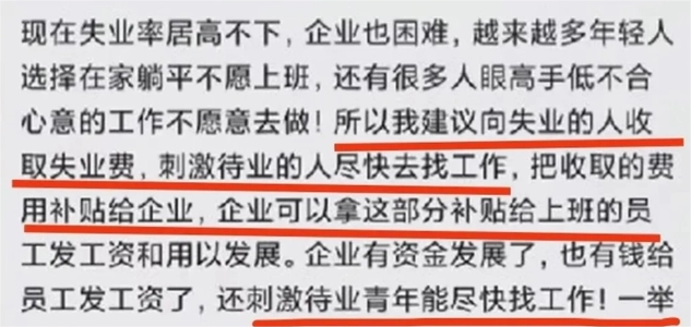 “我们应向失业的人征收失业税,看他还躺平不?还不去找工作吗?这样人人都有工作,有饭吃。”