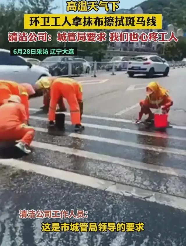 第一件事发生在大连,只见大太阳下,多名环卫工穿着长袖,蹲坐在地上,正徒手用抹布清洁路上的导流线和斑马线。