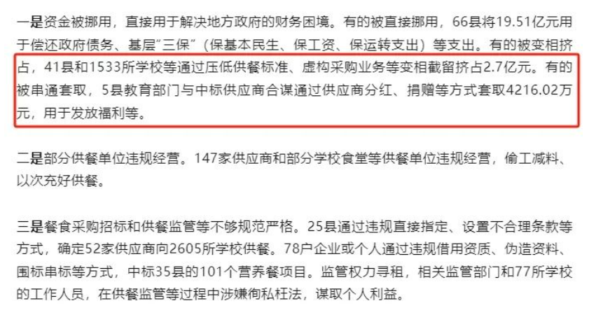 财新报道了多地挪用农村学生营养餐专项补助资金的事,41个县和1533所学校截留挤占经费2.7亿元,5个县套取学生营养餐补助资金4000多万,用于给公务员发福利!