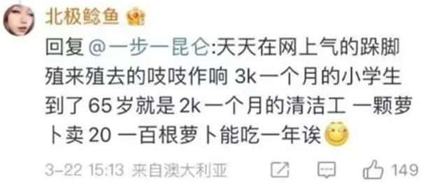 锦句七:“3k一个月的小学生,到了65岁就是2k一个月的清洁工,一颗萝卜卖20,100根萝卜能吃一年”